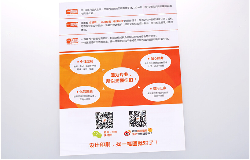 廣告彩頁印刷報(bào)價(jià)規(guī)格參數(shù) 商品名稱 常用銅版紙宣傳單 材質(zhì)類型 157克銅版,200克銅版,250克銅版 成品尺寸 420*285mm 210*285mm 210*140mm 印刷數(shù)量 500張起印 生產(chǎn)方式 合版 加工工藝 覆啞膜......